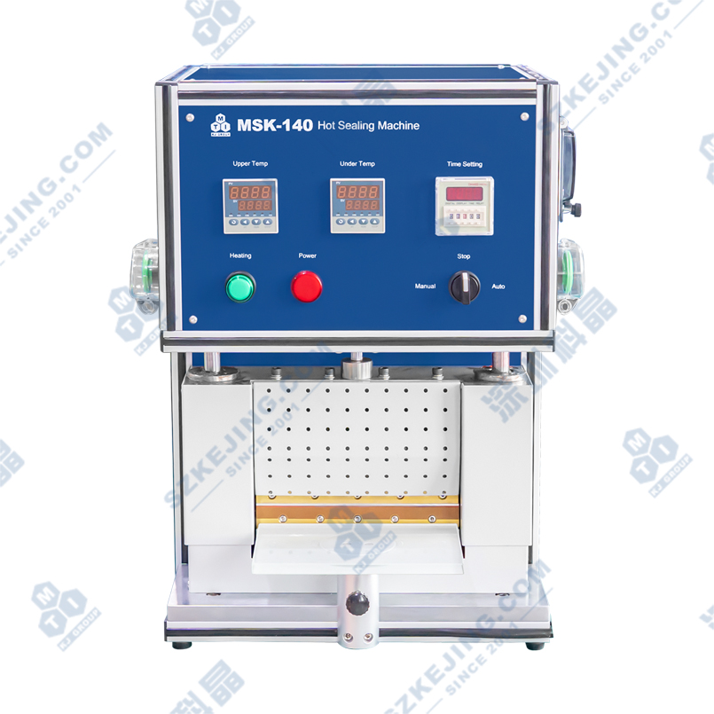 應(yīng)用范圍 :MSK-140型單工位熱封機,搭配夾具使用可應(yīng)用于軟包電池的頂封或側(cè)封工藝。人工上料,手動裝夾,雙按鈕啟動完成封口,人工下料。設(shè)備包含封頭、操作平臺等單元。封頭長度190mm,有效封口長度Max.170mm,最大適用于L170mm*W170mm*T12mm電池。標(biāo)配3.5mm頂軟封,選配6mm側(cè)硬封、4662夾具及饋通模塊,其他規(guī)格的封頭及夾具可根據(jù)客戶的需求定制。
