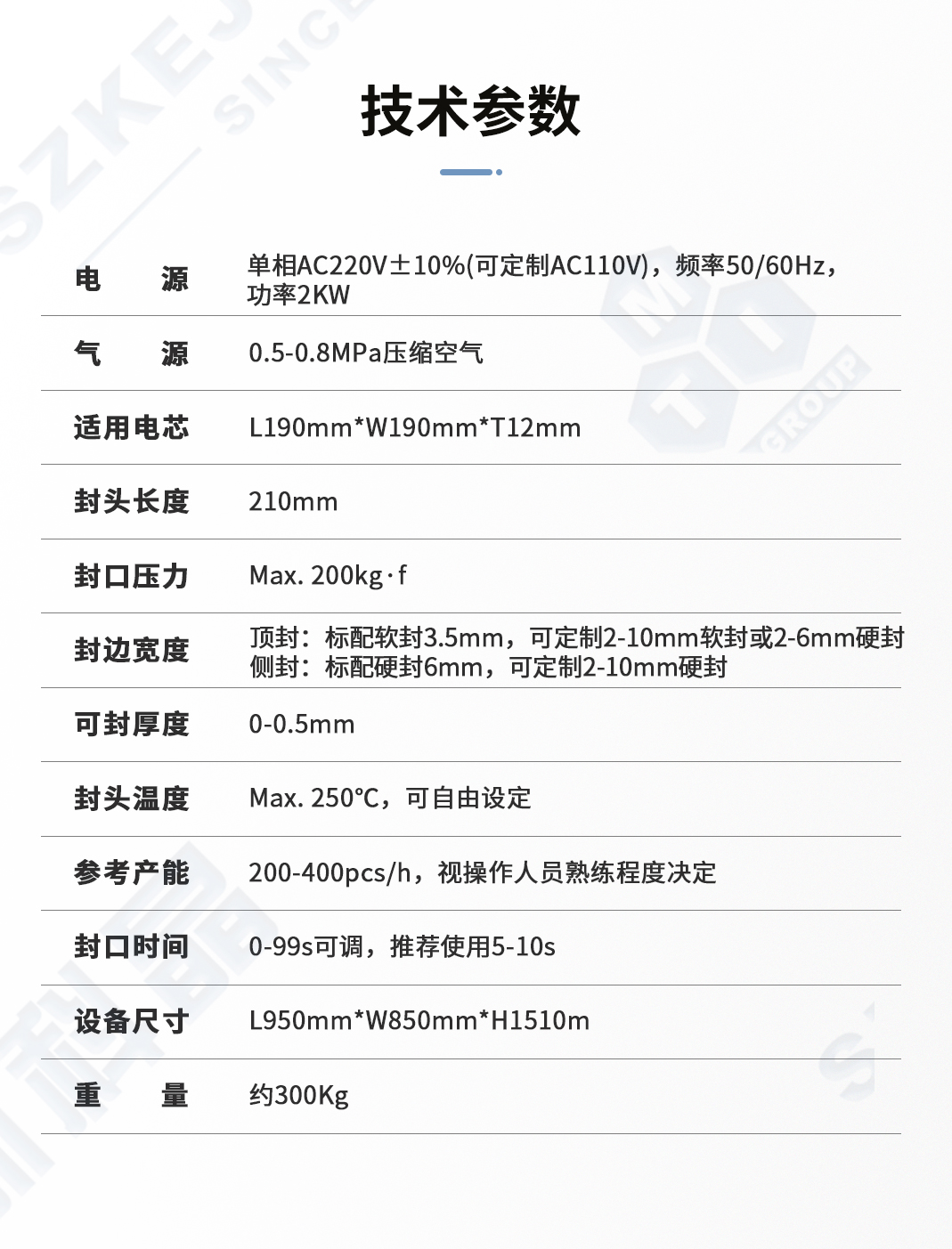 | 封口長度 | 封頭長度210mm,有效封口長度Max.190mm |