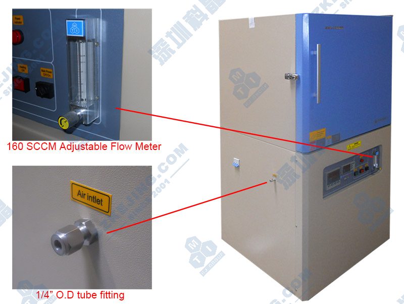 高溫爐背面可選配裝一個(gè)Ф1/4″的寶塔嘴進(jìn)氣口/出氣口。 |