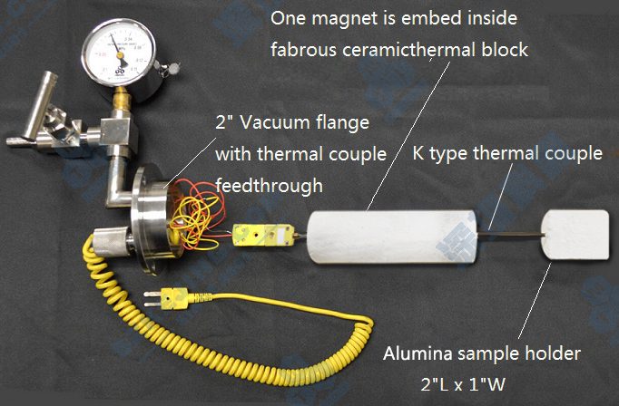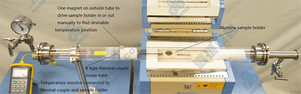 ● 一個(gè)高熱傳導(dǎo)性的氧化鋁樣品托盤固(50mmLx25mmW)定于K型熱電偶上,手動(dòng)移動(dòng)爐管外部磁鐵可推動(dòng)熱偶和樣品盤在爐管內(nèi)移動(dòng),樣品材料蒸發(fā)或沉積。 |