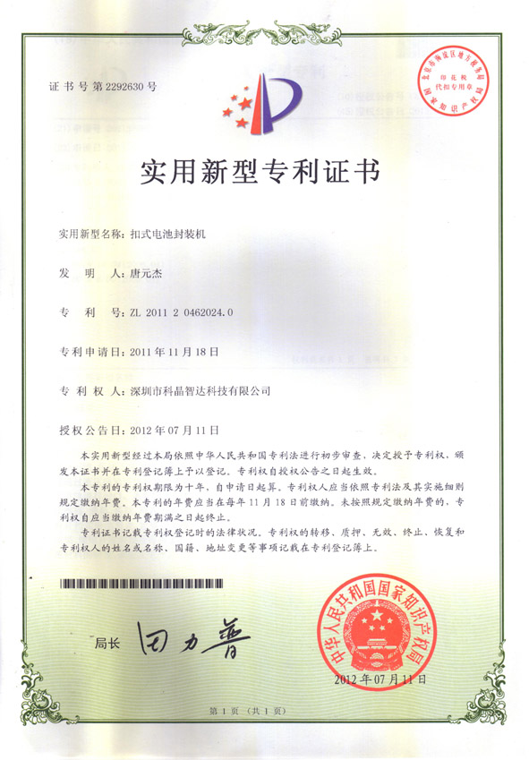 • 科晶集團(tuán)-深圳科晶電池研發(fā)系列設(shè)備榮獲國家知識產(chǎn)權(quán)實用新型設(shè)計專利