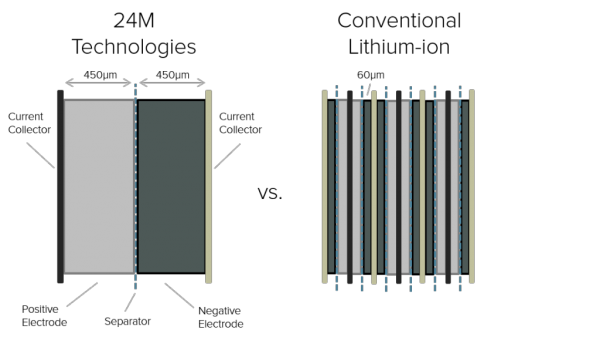 麻省理工學(xué)院的電池科學(xué)家 Yet-Ming Chiang 在2010年成立了24M,24M是由他以前的電池公司A123 Systems衍生而來的。24M的想法是要?jiǎng)?chuàng)造一種可以存儲(chǔ)更多能量的電池,與此同時(shí)還要收縮電池中的其它材料,他相信可以做出更小的電池。Chiang 想知道是否有一種方法可以顯著增強(qiáng)電極,電極就是電池的心臟,并用于充電和放電。同時(shí),他想使電池部分更加小巧,如電極之間的隔板,其保持陽極和陰極的隔離;或電流收集器,它可以從外部電池電路接收電子。在公司成立五年之后的現(xiàn)在,Chiang和他團(tuán)隊(duì)的50余人已經(jīng)找到了一種方法拋棄掉80%以上沒有能量存儲(chǔ)作用的材料,而且相比于傳統(tǒng)鋰離子電池增加了5倍的電極尺寸。如果一個(gè)標(biāo)準(zhǔn)的鋰離子電池的橫截面看起來象一個(gè)非常復(fù)雜的七層餅,24M的電池橫截面看起來像有著很大陽極和陰極的雙層餅。