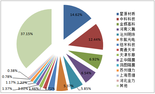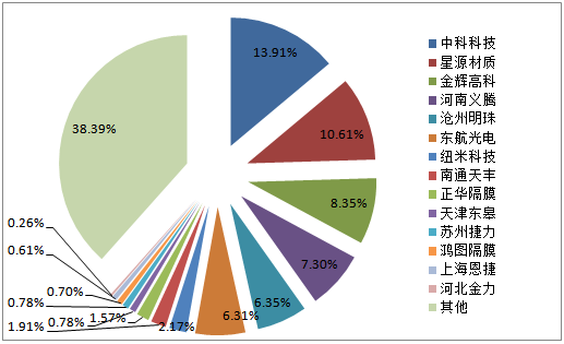 圖10 2014年中國(guó)隔膜產(chǎn)業(yè)主要企業(yè)市場(chǎng)占有率(按銷(xiāo)售收入)