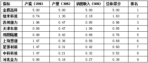 在企業(yè)成長(zhǎng)潛力的判斷中,賽迪顧問(wèn)依然選取了產(chǎn)量增速、銷(xiāo)售收入增速和資本運(yùn)作能力三個(gè)指標(biāo)作為判斷隔膜企業(yè)成長(zhǎng)潛力的基礎(chǔ)指標(biāo),并分別賦予20%、30%和50%的權(quán)重。最終的評(píng)價(jià)結(jié)果如下表所示: