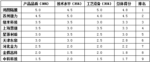 星源材質(zhì)以綜合得分4.8分排名第一,滄州明珠以綜合得分4.3分排名第二,中科科技以綜合得分3.7分排名第三。后續(xù)企業(yè)排名依次為河南義騰、東航光電、南通天豐和正華隔膜。