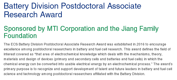 ECS電池研究部首次建立博士后獎,對全球進(jìn)行新能源研究的博士后開放,此獎是由MTI贊助的,將在今年10月的全球電化學(xué)會上首次發(fā)布。