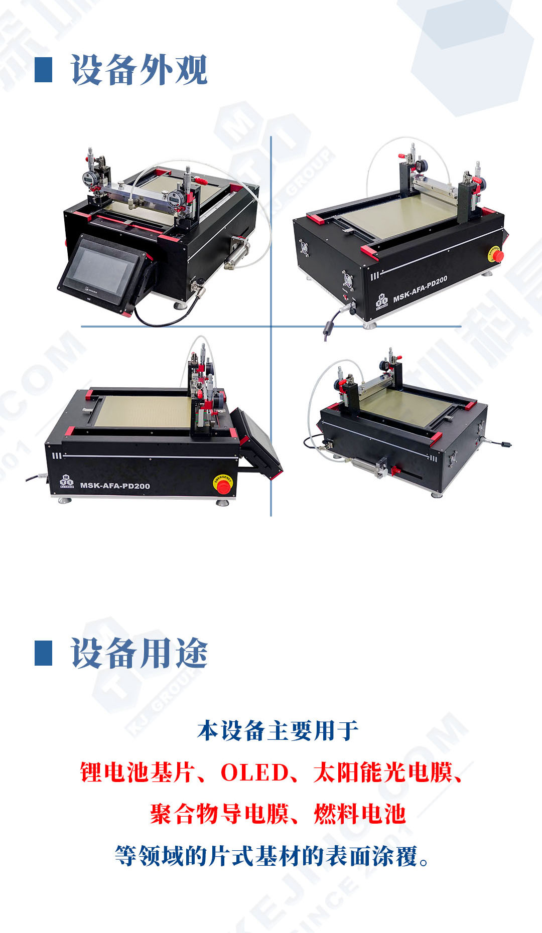 應(yīng)用范圍:MSK-AFA-PD200型片式平板涂覆機(jī),配置擠壓涂布模具,直線柱塞供料,最小料損約18ml,最大涂覆尺寸200x300mm,可在手套箱內(nèi)使用,適合低粘度小于1000mPa.s,可選配刮刀、線棒、四面制模器涂布。