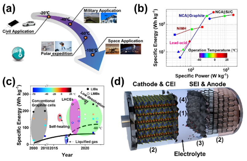 圖1.(a)鋰離子電池在低溫下廣泛應用,(b)基于石墨負極和硅碳負極的商用鋰離子電池與商用鉛酸,鎳氫電池的低溫性能對比,(c)鋰離子/金屬電池的研究進展,包括性能對比與使用的策略,(d)鋰離子/金屬電池在低溫下面臨的挑戰(zhàn)。