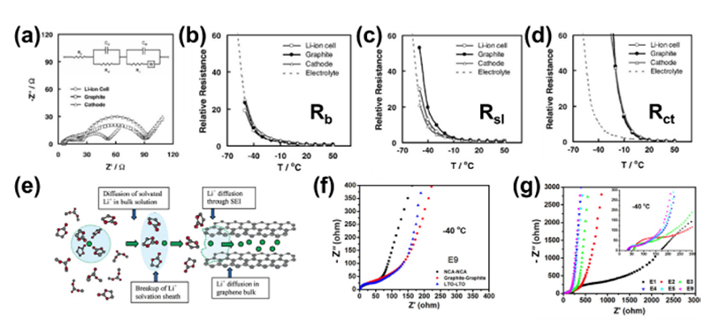 圖2.(a)-(d)低溫下鋰離子電池界面轉(zhuǎn)移阻抗(Rct)的增加占主導,(e)電荷轉(zhuǎn)移過程的阻抗主要包含脫溶劑過程與Li+穿過SEI的過程帶來的阻抗,(f)-(g)相同電解液下不同電極(NCA,石墨,LTO)對稱電池表現(xiàn)出相近的阻抗,而在不同碳酸酯基電解液阻抗表現(xiàn)出巨大差異。