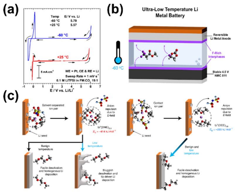 圖4.(a)液化氣電解液在室溫與-60 ℃下的CV曲線,(b)全氟化電解液有效改善高壓鋰金屬電池的低溫性能,(c)低溶劑化能的醚基電解液可以抑制低溫下鋰枝晶的生長