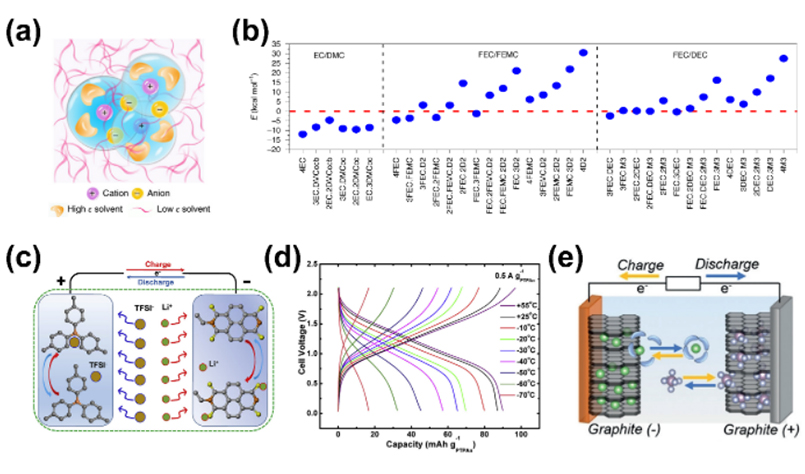 圖5.(a)局部高濃電解液的獨特溶劑化結(jié)構(gòu),(b)局部高濃電解液具有較低的脫溶劑化能,(c)-(d)基于有機正負極的雙離子電池避免脫溶劑能的機理與低溫性能,(e)基于雙石墨電極的雙離子電池避免脫溶劑能的工作機理。