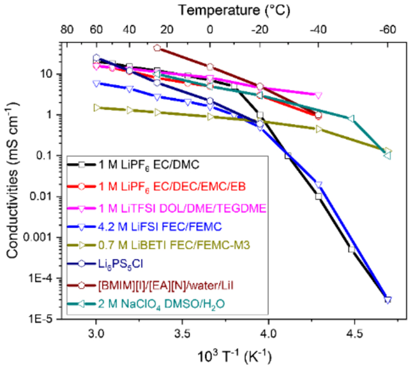 除了對傳統(tǒng)有機溶劑基的電解液的低溫性能探索,水系電解液,離子液體基電解液和固態(tài)電解質(zhì)近年來也有廣泛的進展,而足夠的低溫離子電導率是進一步研究的基礎,圖6梳理了部分具有代表性的電解質(zhì)的離子電導率。