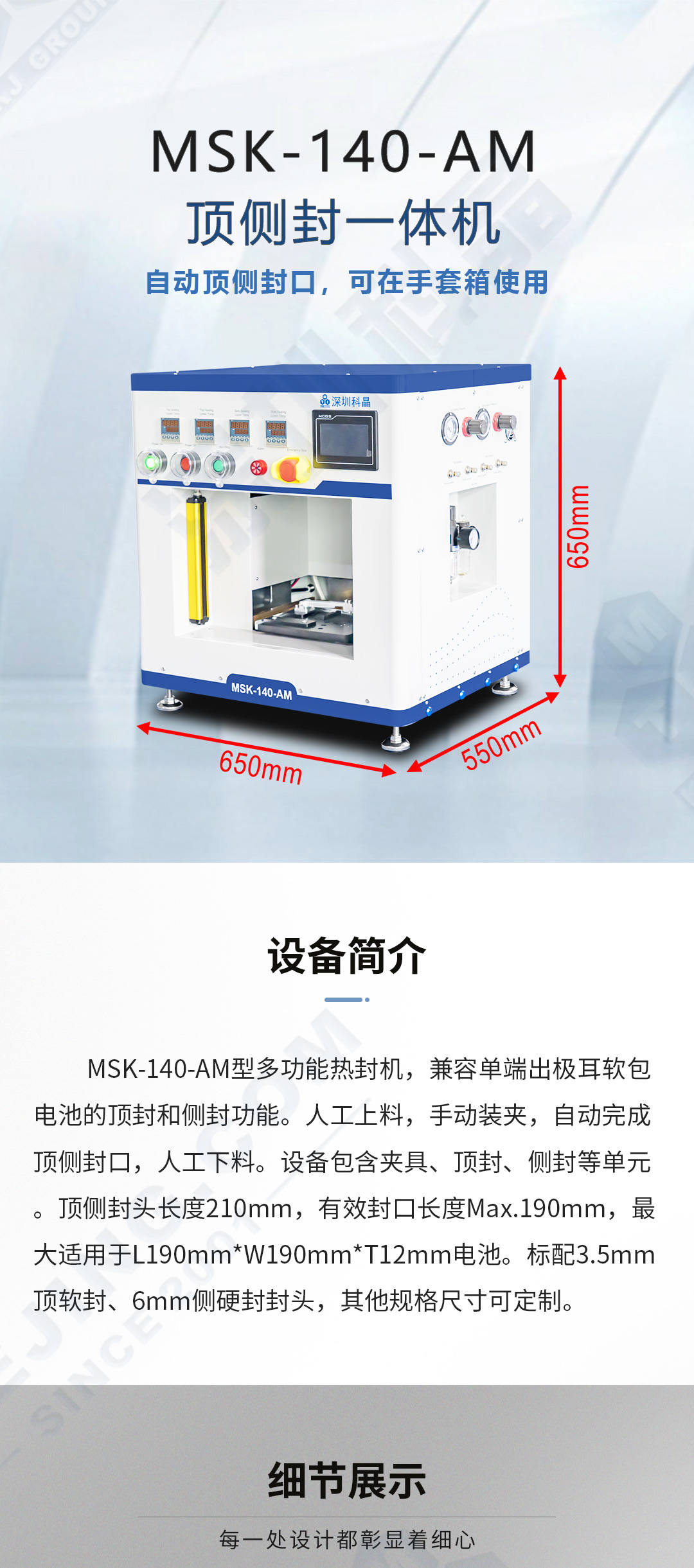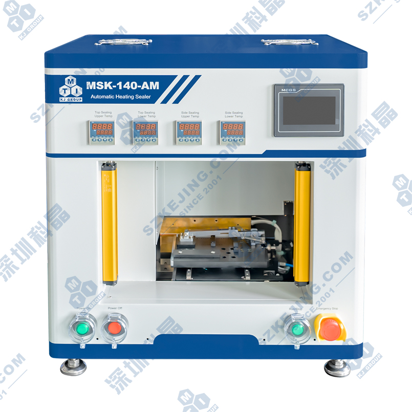 應(yīng)用范圍:MSK-140-AM型多功能熱封機(jī),兼容單端出極耳軟包電池的頂封和側(cè)封功能。人工上料,手動裝夾,自動完成頂側(cè)封口,人工下料。設(shè)備包含夾具、頂封、側(cè)封等單元。頂側(cè)封頭長度210mm,有效封口長度Max.190mm,最大適用于L190mm*W190mm*T12mm電池。標(biāo)配3.5mm頂軟封、6mm側(cè)硬封封頭,其他規(guī)格尺寸可定制。